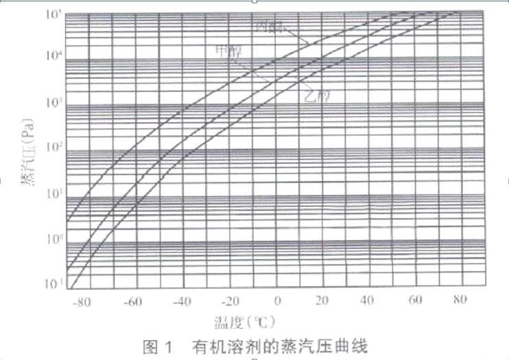 原料藥生產(chǎn)常用的溶媒是甲醇、丙酮、乙醇等有機溶劑或其他復(fù)合溶劑,它們的共同特點是低沸點、高飽和蒸汽壓。對于抽濾和干燥工藝來說,通常有真空泵前和泵后冷凝兩種方式,也稱為進(jìn)氣側(cè)冷凝和排氣側(cè)冷凝,都需要把介質(zhì)冷卻到工作壓力對應(yīng)的沸點之下。幾種常用有機溶劑的蒸汽壓曲線(見圖1)。從曲線看出,在干燥工藝的極限壓力范圍(0.1 ~100 Pa)內(nèi),三種溶劑的沸點在-90℃與-30℃之間,必須采用深冷或冷阱冷凝。而在常壓下(≤ 1.013×105Pa),三種溶劑的沸點在56℃與78℃之間,只須用循環(huán)水即可冷凝。二者比較,排氣側(cè)冷凝回收的條件最簡單,也是最經(jīng)濟(jì)的。