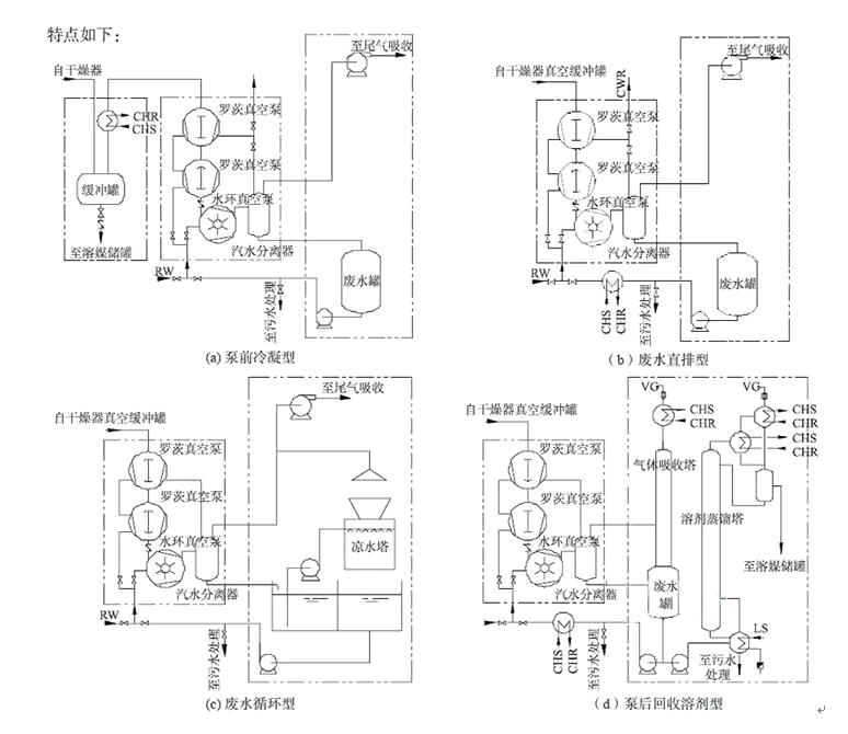 從上述分析看出,雖然設(shè)計了多種濕式真空系統(tǒng),以期回收溶劑,減少污染排放,但效果不佳。這是由溶媒特性和濕式真空泵本身特點所決定的,只有使用干式真空系統(tǒng)和配套的冷凝回收系統(tǒng),才能徹底解決這個問題。