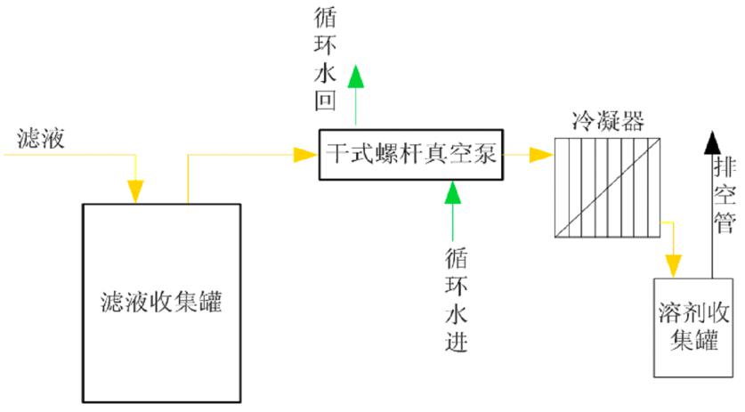 在制藥工藝中有很多的步驟需要將固、液混合物中的固體與液體分離,在這個分離過程中大多使用抽濾方式來實現(xiàn)。實驗測試液體組成為95:5的丙酮、乙醇混合液,使用干式螺桿真空泵的工藝流程如下: